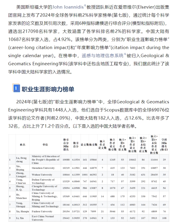 全球前2%顶尖科学家榜单由斯坦福大学John P. A. Ioannidis教授团队发布,2024年版本也是该团队公布的第七个版本。该团队基于Scopus数据库,提供总引用量、h-指数、共同作者修正的hm-指数、不同作者位置的引用及综合指标(c-score)等标准化信息。考虑到不同研究领域的差异,该榜单将科学家划分为22个领域和174个细分子领域,力求为科学家长期科研表现提供一个衡量指标,以期能够更客观、更真实地反映科学家的学术影响力。榜单主要分为“终身科学影响力排行榜(career-long impact)”和“年度科学影响力排行榜(single-year impact)”两个榜单。