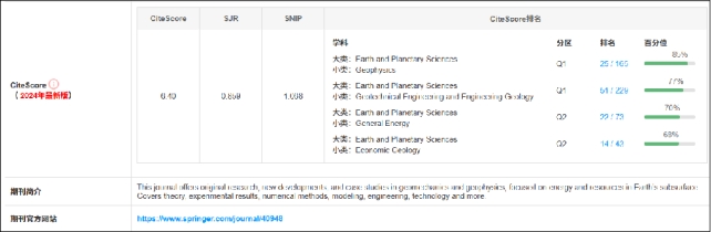 《Geomechanics and Geophysics for Geo-Energy and Geo-Resources》是一本专注于地质力学和地球物理学领域的English学术期刊,创刊于2015年,由Springer International Publishing出版商出版。该刊涵盖地质力学和地球物理学的全部范围,包括理论和分析、实验室和现场实验、数值方法和建模技术,以及与能源和资源相关的工程应用和技术开发,旨在及时、准确、全面地报道国内外工作者在该领域的科学研究等工作中取得的经验、科研成果、技术革新、学术动态等。该刊在中科院最新升级版分区表中,该刊分区信息为大类学科工程技术2区,JCR一区期刊,2023年影响因子为3.9。